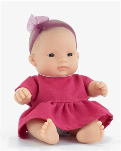 Liten jentedukke fra Miniland. Dukken er anatomisk korrekt og har naturtro detaljer.