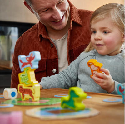 Dyr på dyr Junior er et herlig første stablespill for små barn. Her kan de bygge morsomme tårn og figurer ved hjelp av åtte robuste trefigurer som er gode å holde i. Barna kaster terningen for å finne ut hvilket dyr som skal legges på neste – og spenningen øker når tårnet begynner å gynge. Spillet byr på flere varianter, slik at barna kan spille alene, samarbeide eller prøve et lite dyreløp.