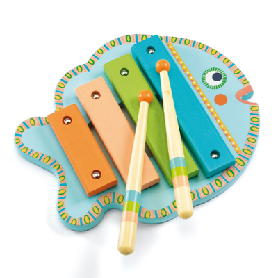 Morsom xylofon i malt treverk, formet som en glad og fargerik fisk! Bruk de medfølgende trepinnene for å spille på de fire ulike tonene. Et fint første instrument til de mindre barna! Fra det franske merket Djeco.